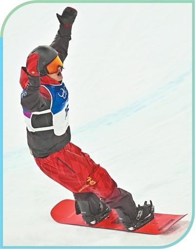 中國隊選手王梓陽在單板滑雪男子U型場地技巧資格賽中慶祝。新華社記者 張宏祥攝