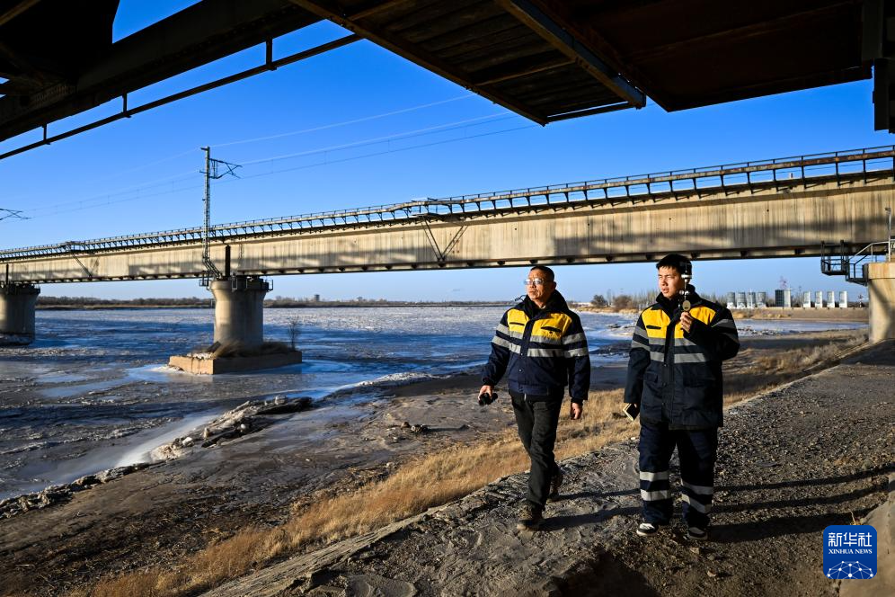 2月10日,白宇泰(前)在包銀高鐵磴口黃河特大橋下進行巡檢作業。新華社記者 李志鵬 攝
