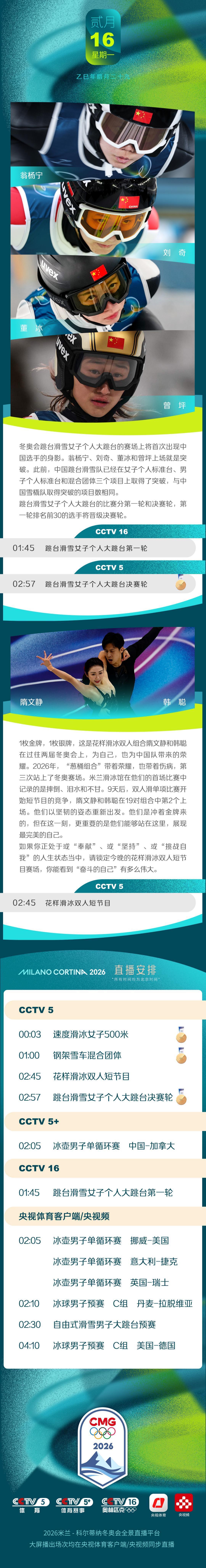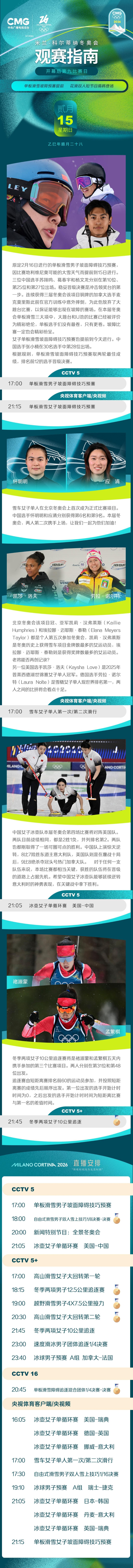 米蘭-科爾蒂納冬奧會開幕后第九比賽日,單板滑雪坡障預賽提前,花滑雙人短節目“隋韓”登場。