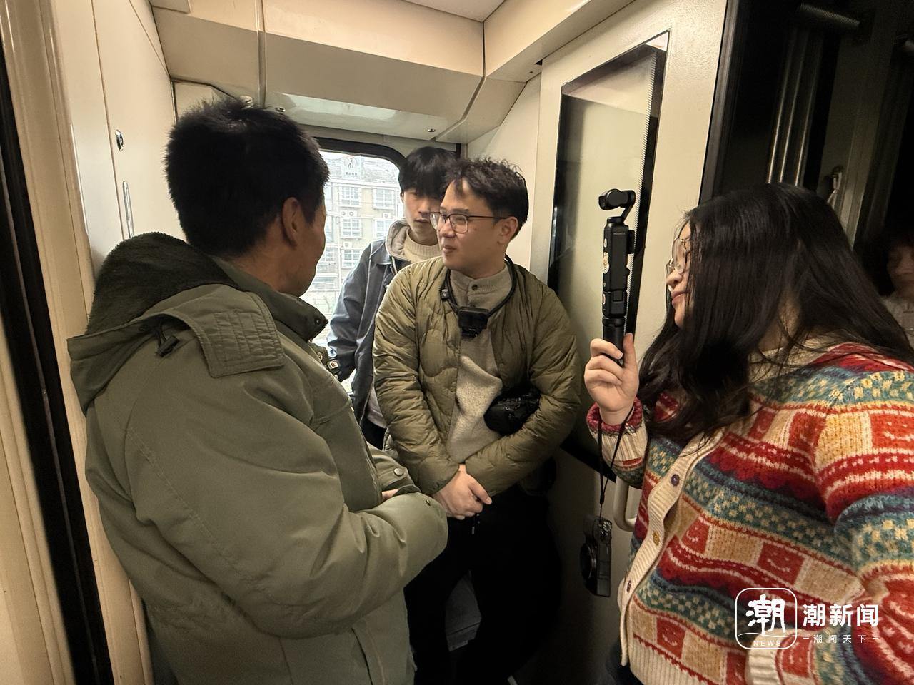 記者穿梭在車廂間采訪、拍攝,陌生大哥從年貨箱里掏出桂花糕遞過(guò)來(lái),“你們也辛苦了,做記者不容易。”