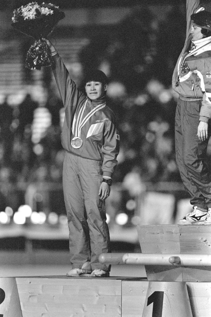 ↑1992年2月10日,中國選手葉喬波在頒獎儀式上。新華社記者 李根興 攝