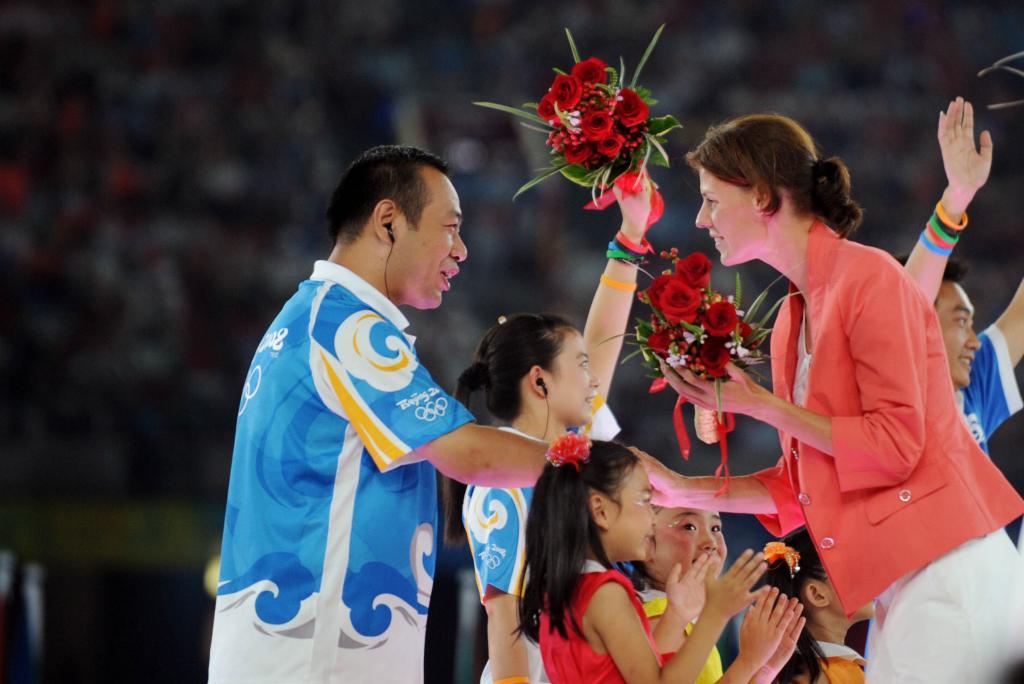 這是志愿者代表(左)在2008年北京奧運會閉幕式上接受國際奧委會運動員委員會新委員的獻(xiàn)花(2008年8月24日攝)。 新華社記者李尕攝