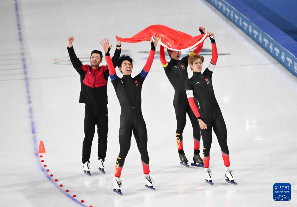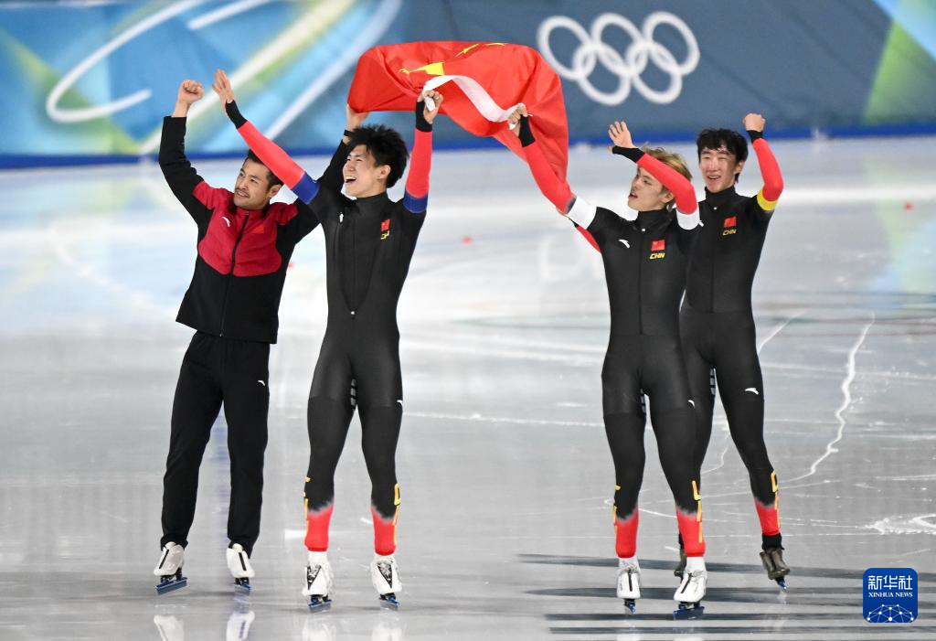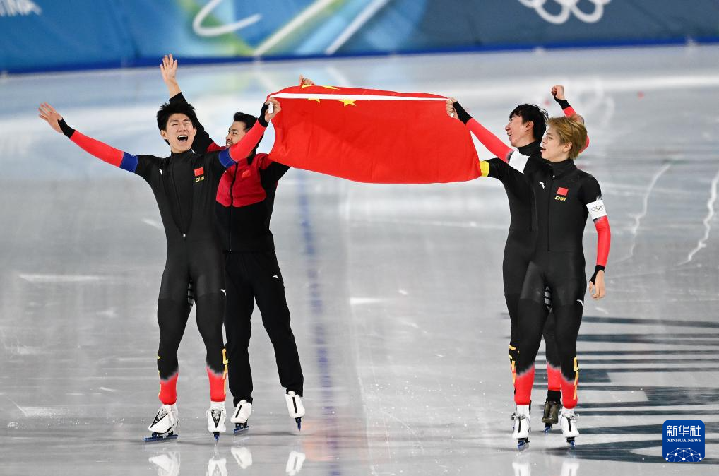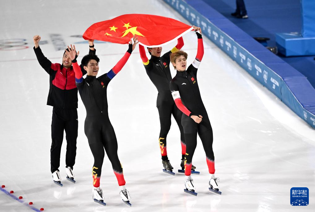 2月17日,中國(guó)隊(duì)選手李文淏、劉瀚彬、寧忠?guī)r、吳宇(從左至右)在賽后慶祝。新華社記者 杜瀟逸 攝