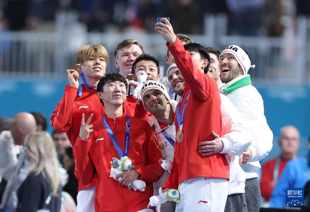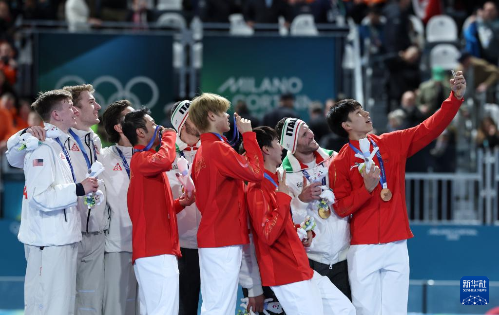 2月17日,冠軍意大利隊(duì)、亞軍美國(guó)隊(duì)和季軍中國(guó)隊(duì)在頒獎(jiǎng)儀式上自拍留影。新華社記者 杜瀟逸 攝