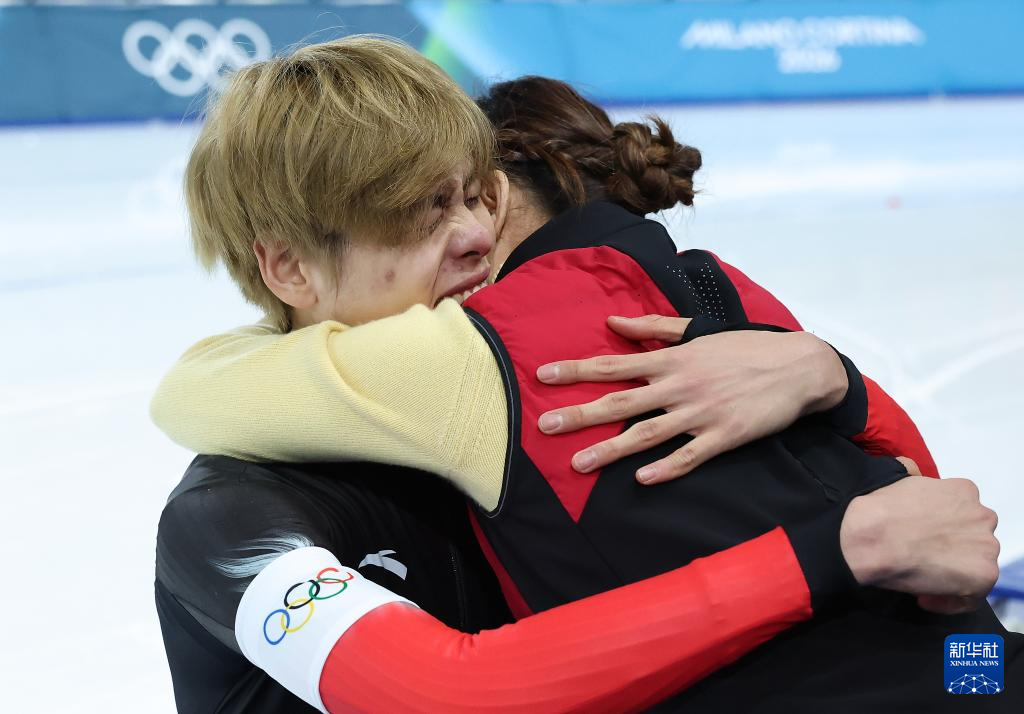 2月17日,中國(guó)隊(duì)選手李文淏(右)和劉瀚彬在賽后擁抱。新華社記者 李京 攝