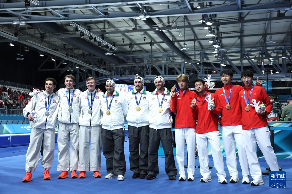 2月17日,冠軍意大利隊(duì)(中)、亞軍美國(guó)隊(duì)(左)和季軍中國(guó)隊(duì)在頒獎(jiǎng)儀式上合影。新華社記者 李京 攝