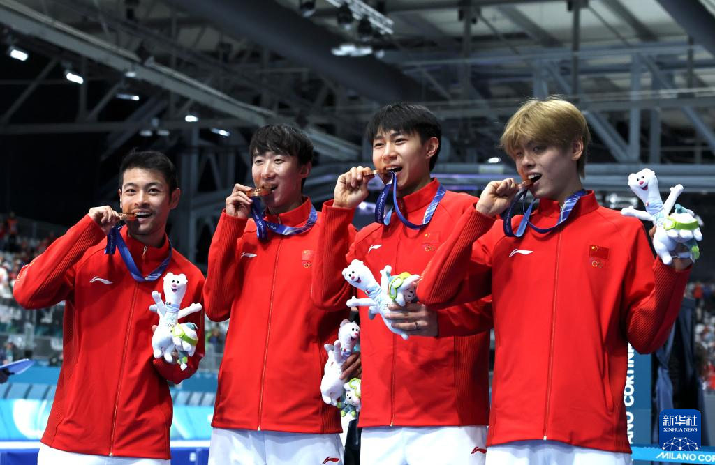 2月17日,季軍中國(guó)隊(duì)選手李文淏、劉瀚彬、寧忠?guī)r、吳宇(從左至右)在頒獎(jiǎng)儀式上。新華社記者 武巍 攝