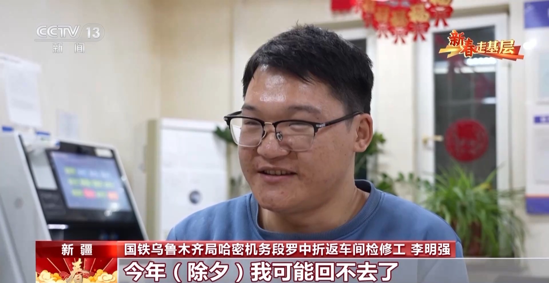 國鐵烏魯木齊局哈密機務段羅中折返車間檢修工 李明強:爸、媽,兒子在這給您拜年了。今年除夕我可能回不去了,但是你放心。大漠戈壁也是另一種風景,羅布泊有平時看不見的星空,落日也非常漂亮。在這里走好自己的每一步,就是對我們西部更好的一個發展。我覺得我的青春能在這里綻放出更加絢麗的色彩。