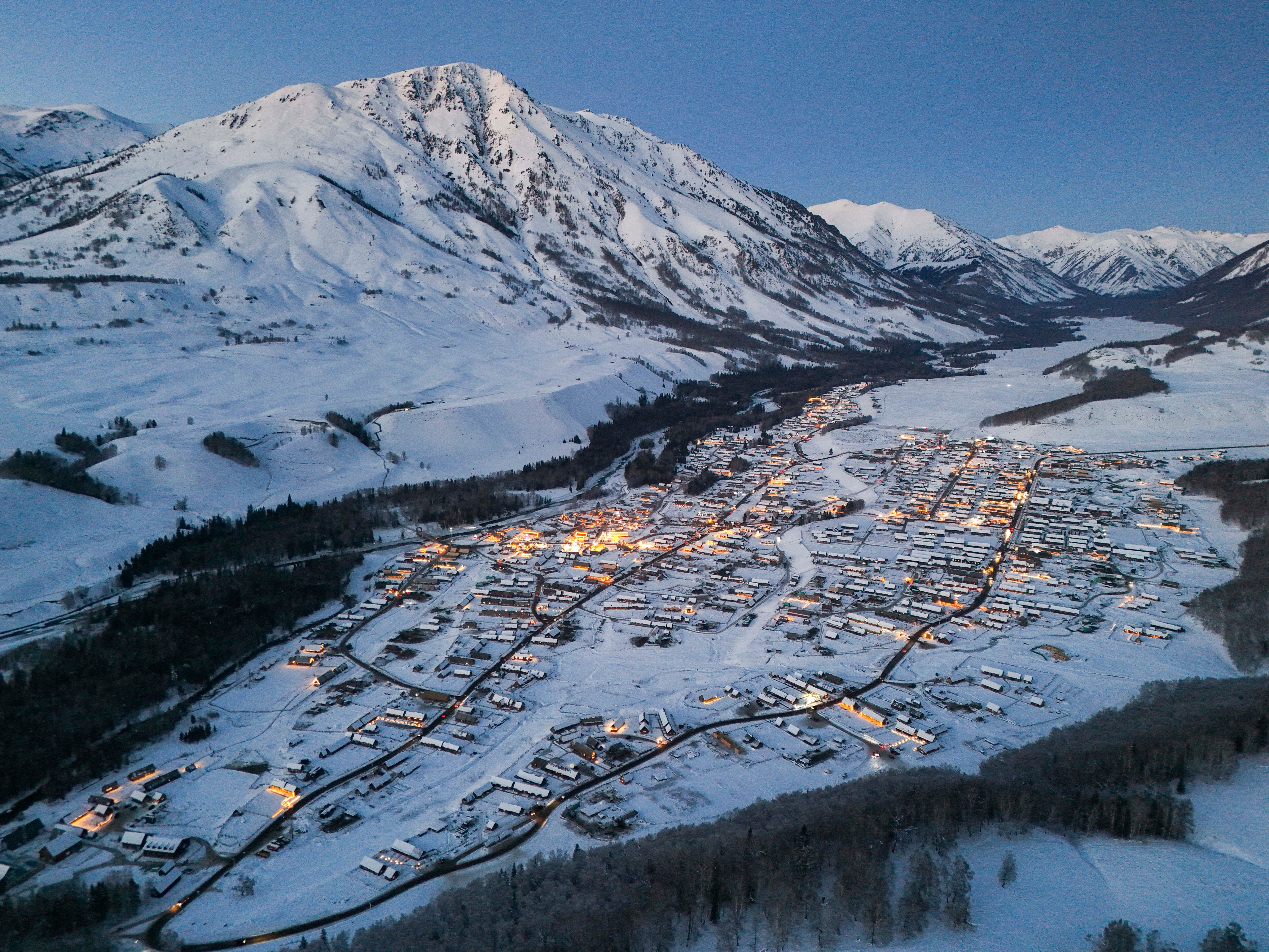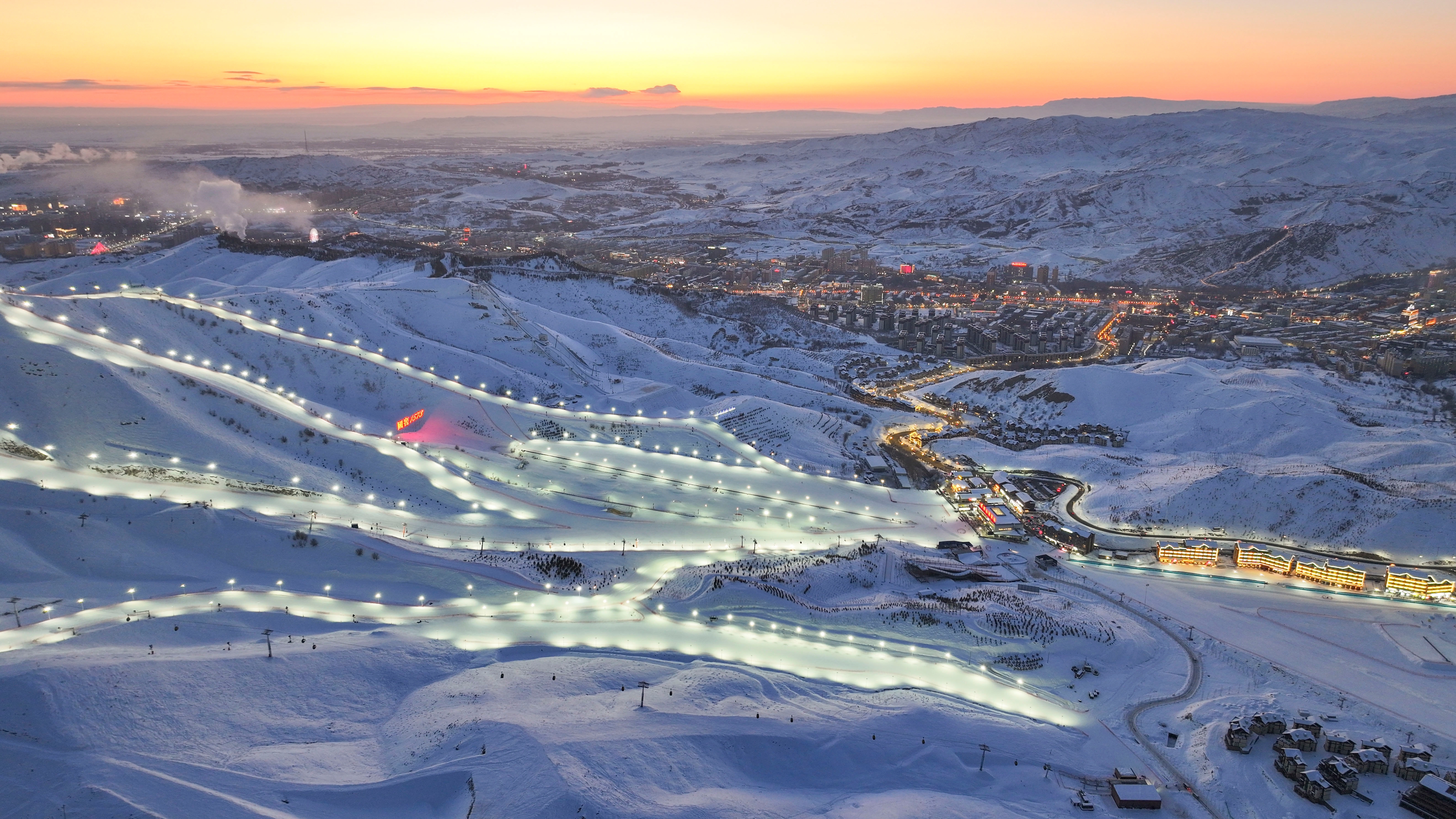 夜幕降臨,新疆阿勒泰將軍山國(guó)際滑雪度假區(qū)即將開(kāi)啟夜場(chǎng)運(yùn)營(yíng)(2025年1月24日攝,無(wú)人機(jī)照片)。新華社記者 胡虎虎 攝
