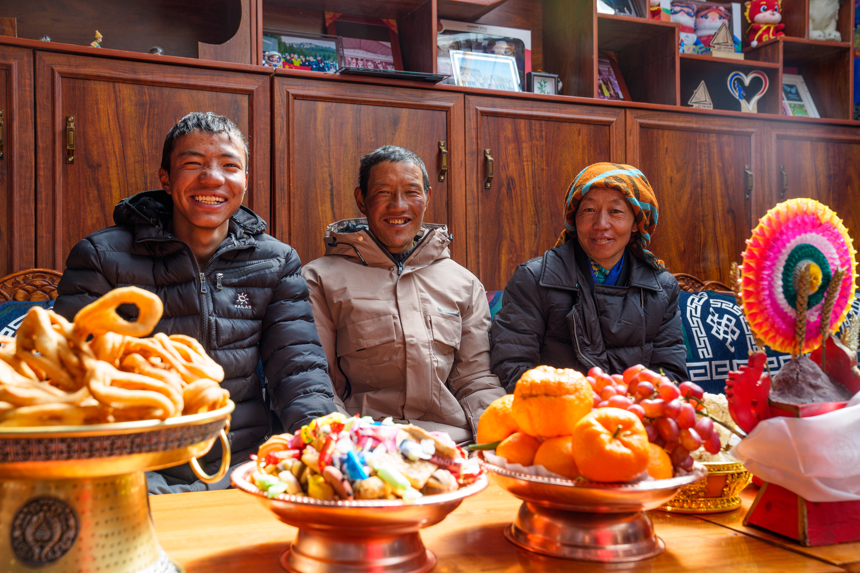 次旦玉珍的父親旦增群培(中)、母親德吉卓瑪(右)和弟弟達(dá)瓦頓珠坐在家中,背后的書(shū)架上擺放著許多次旦玉珍的參賽照片和參賽紀(jì)念品(2026年2月7日攝)。新華社記者 丁增尼達(dá) 攝