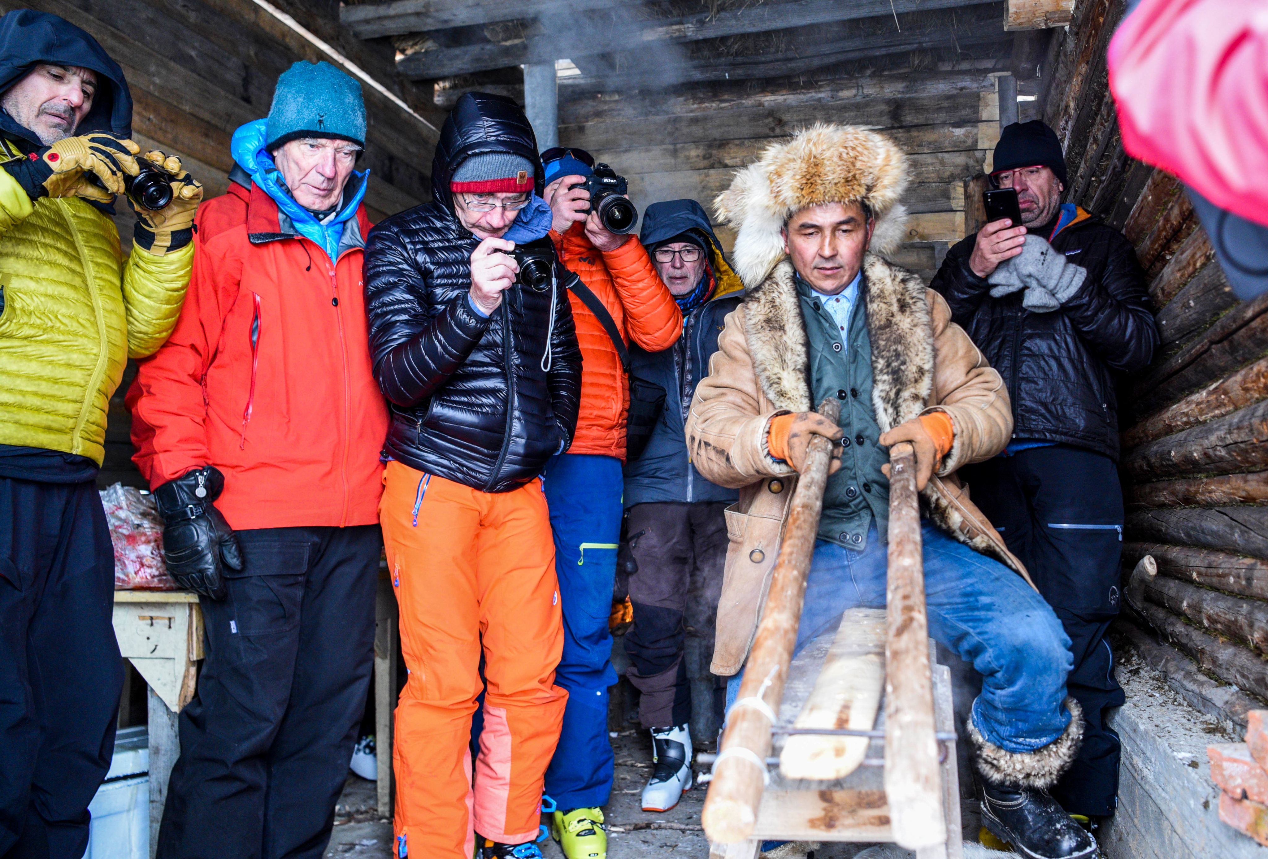 在新疆阿勒泰地區(qū)禾木村,來(lái)自歐洲的雪友觀看牧民制作古老毛皮滑雪板(2019年1月10日攝)。新華社記者 胡虎虎 攝