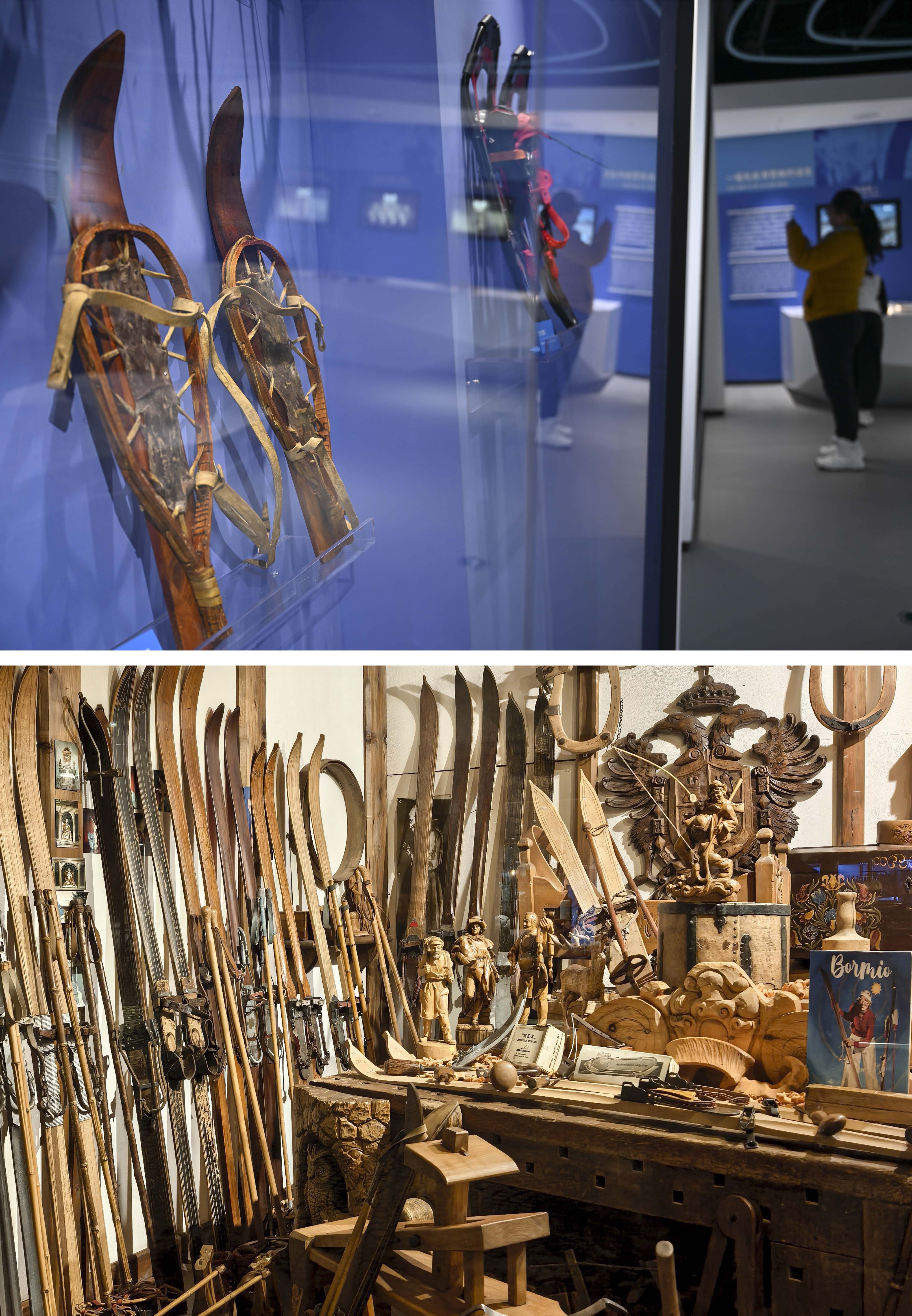 拼版照片:上圖為游客在中國(guó)新疆阿勒泰人類(lèi)滑雪起源地博物館參觀(2025年1月24日攝)。下圖為在意大利博爾米奧拍攝的一家展示老式滑雪板的門(mén)店(2026年2月5日攝)。均為新華社記者 胡虎虎 攝