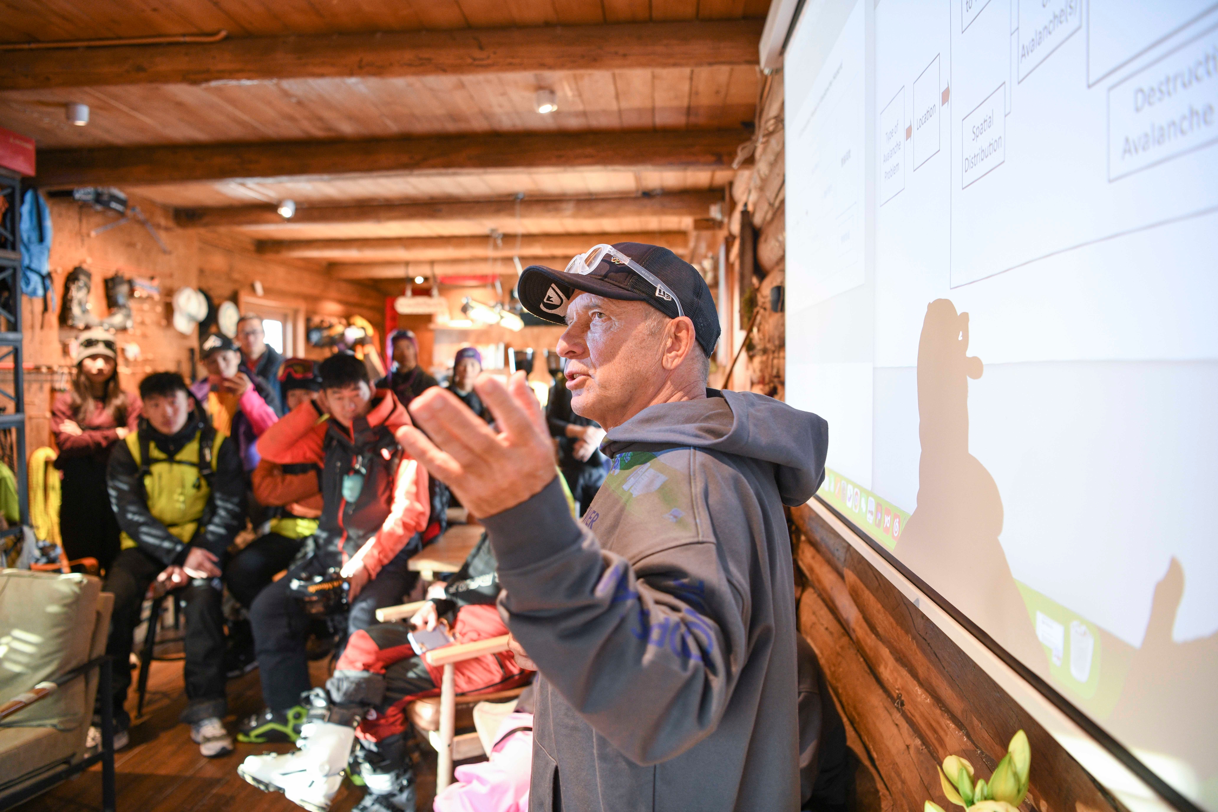 在新疆阿勒泰禾木吉克普林國(guó)際滑雪度假區(qū),一名來(lái)自新西蘭的滑雪專(zhuān)家向中外雪友分享雪崩風(fēng)險(xiǎn)管理等知識(shí)(2024年12月3日攝)。新華社記者 胡虎虎 攝