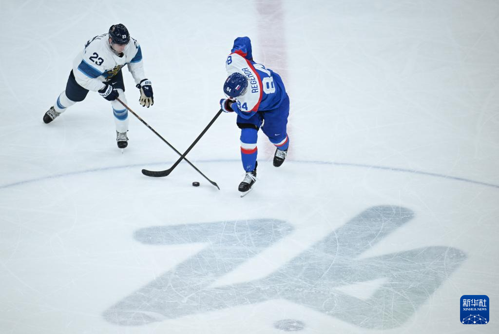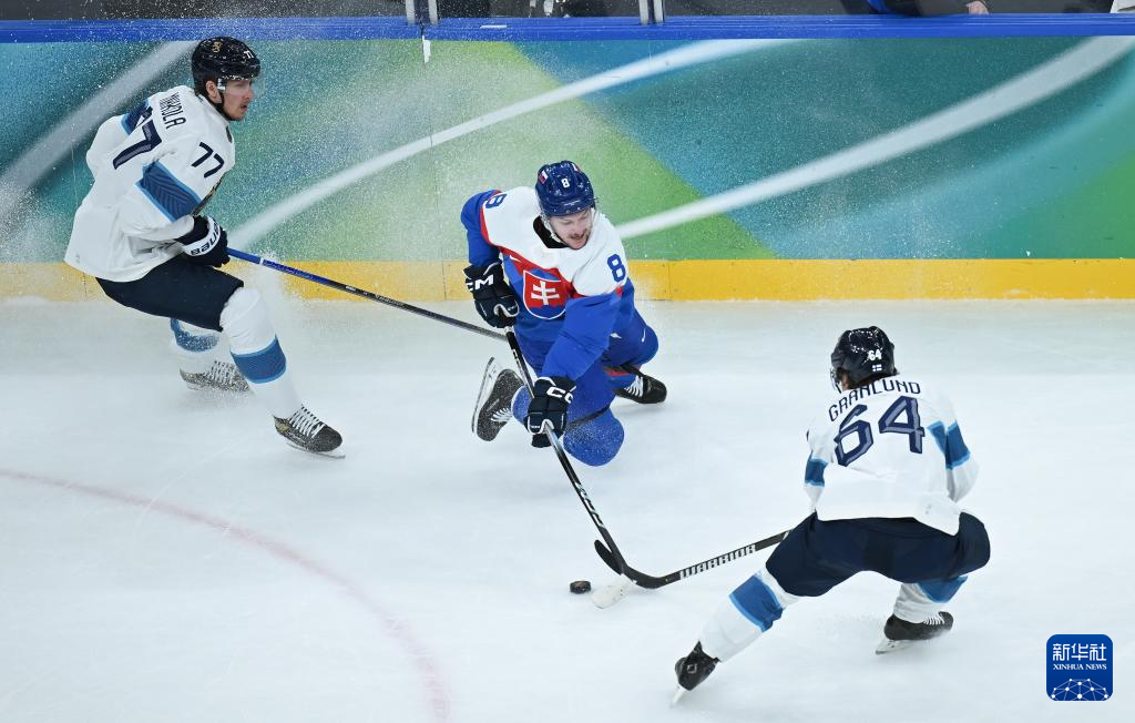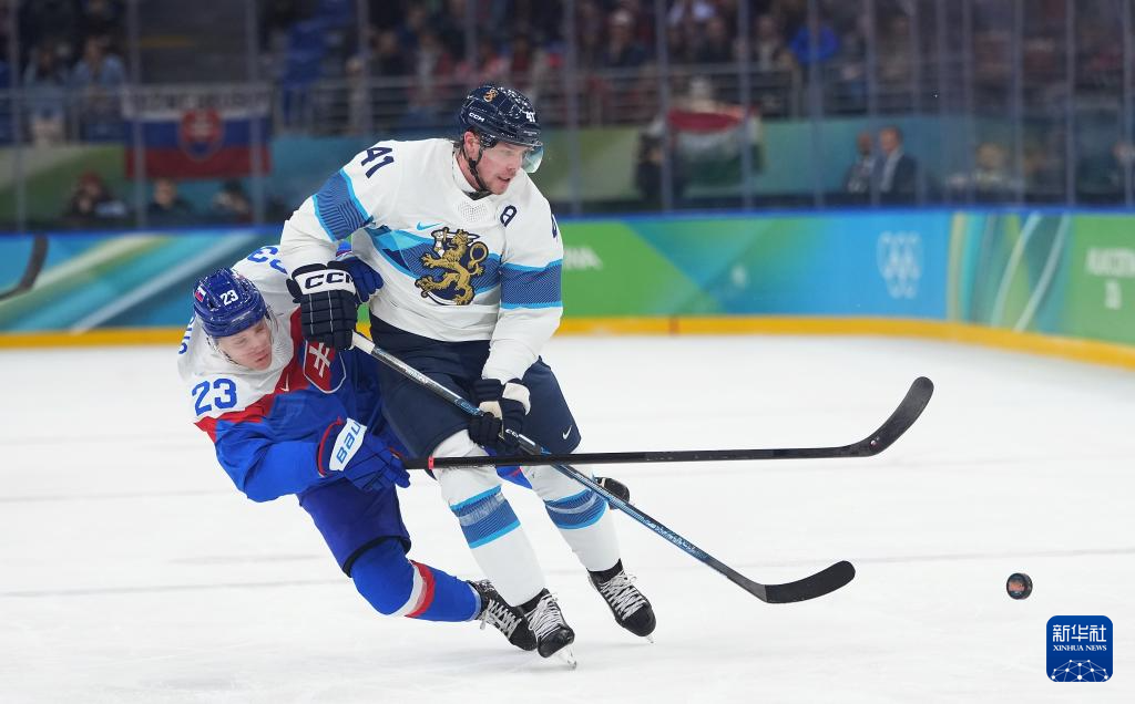 2月21日,芬蘭隊(duì)球員格蘭隆德(右)和斯洛伐克隊(duì)球員斯拉夫科夫斯基在比賽中拼搶。新華社記者 張豪夫 攝