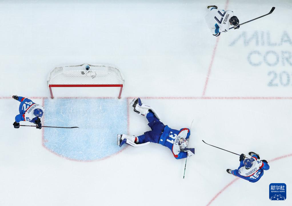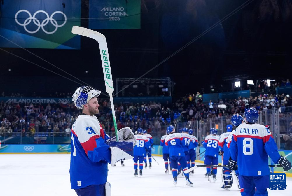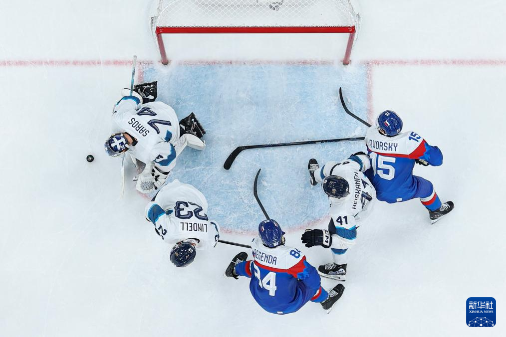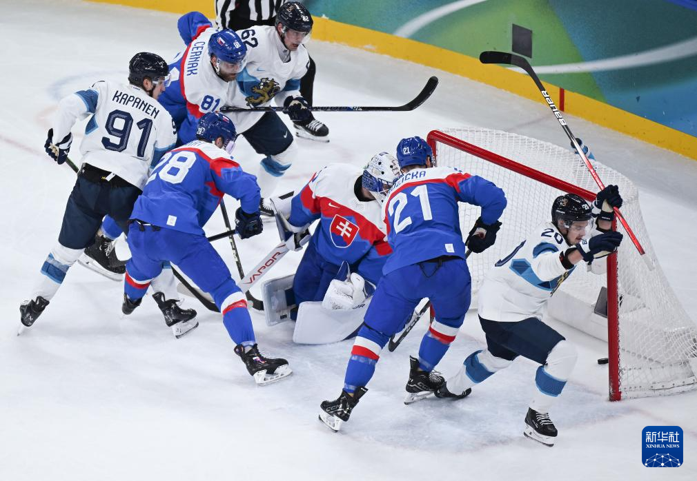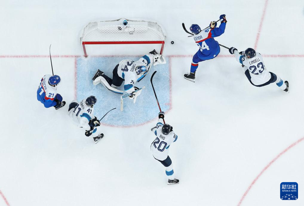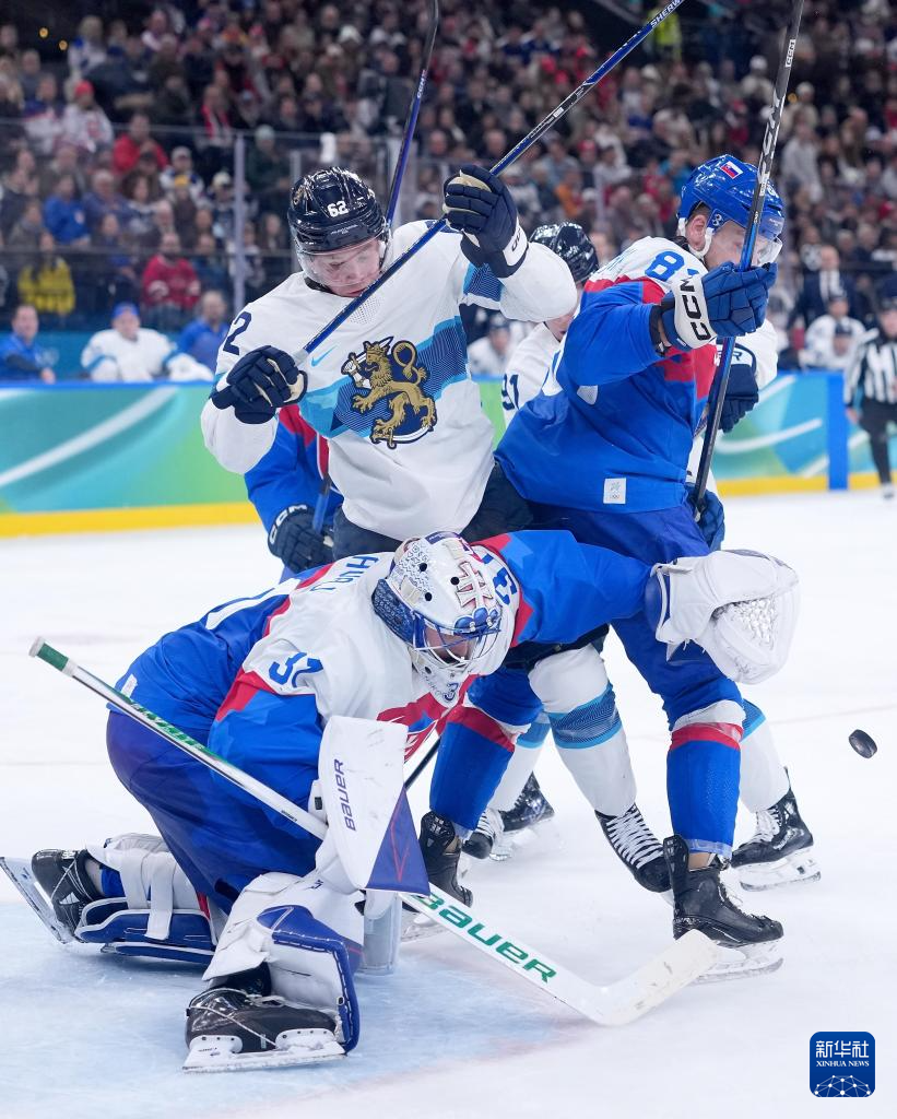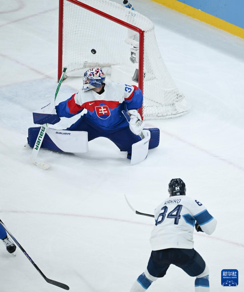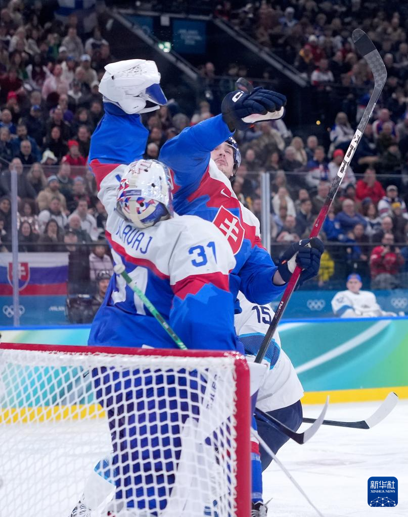 2月21日,斯洛伐克隊(duì)守門(mén)員哈拉維(左二)在比賽中撲救。新華社記者 張豪夫 攝