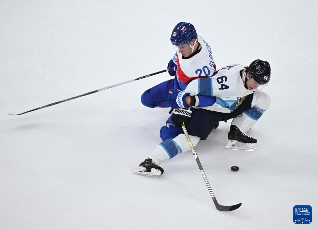 2月21日,芬蘭隊(duì)球員海斯卡寧(右)和斯洛伐克隊(duì)球員利斯卡在比賽中拼搶。新華社記者 陶希夷 攝