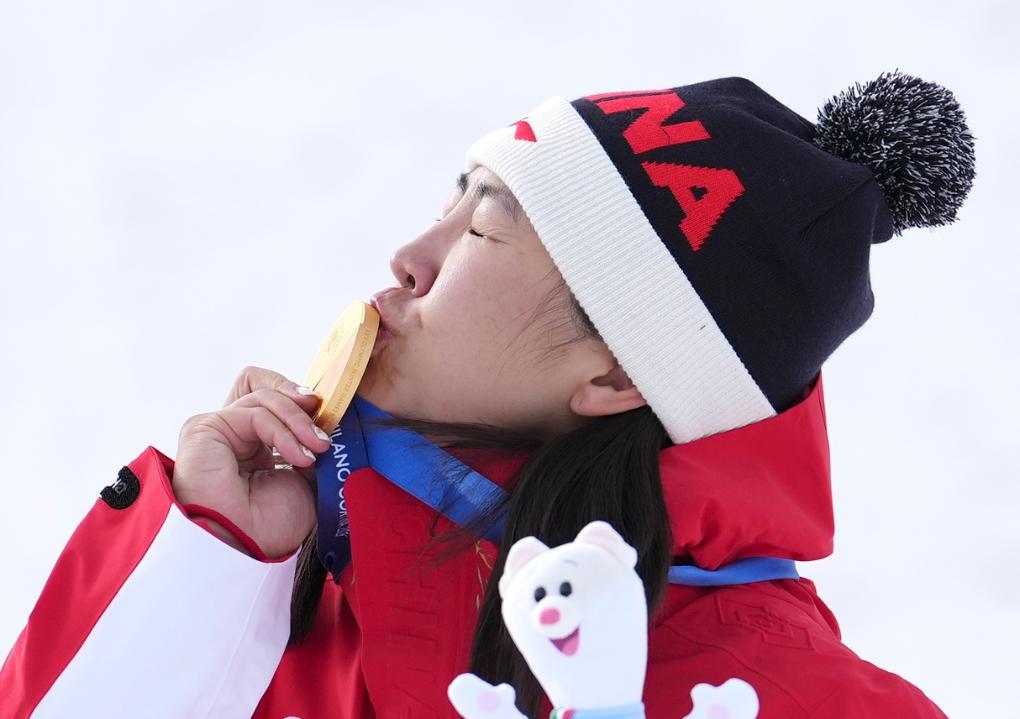 2月18日,冠軍中國選手徐夢桃在自由式滑雪女子空中技巧頒獎儀式上親吻金牌。新華社記者 胡超 攝