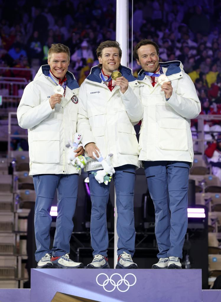 2月22日,越野滑雪男子50公里集體出發(傳統技術)冠軍挪威選手克萊博(中)、亞軍挪威選手尼格特(左)和季軍挪威選手伊韋爾森在閉幕式現場舉行的頒獎儀式上。新華社記者 李明 攝