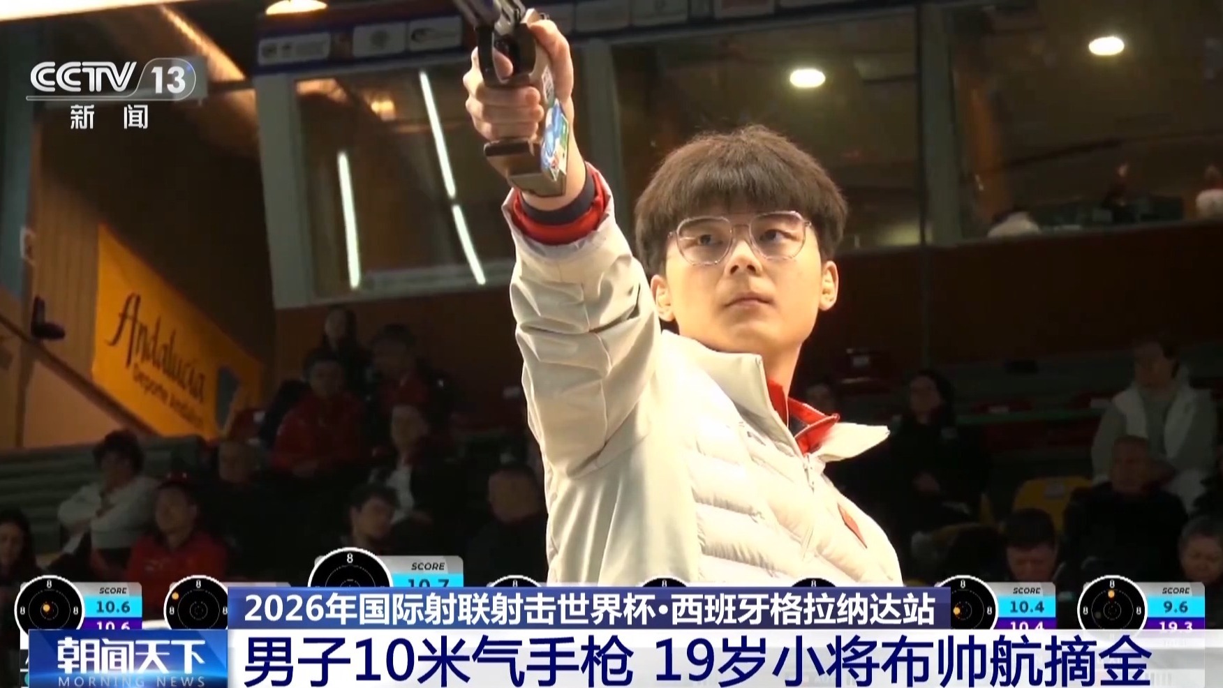 昨晚,2026年國(guó)際射聯(lián)射擊世界杯西班牙格拉納達(dá)站中,中國(guó)19歲小將布帥航以244.5環(huán)奪得男子10米氣手槍金牌。