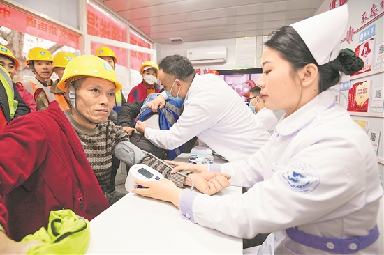 1月9日,在中建四局華潤置地貴陽九悅綜合體項目部勞動者驛站,貴州省第四人民醫(yī)院的醫(yī)護(hù)人員正為建設(shè)者們開展健康義診。當(dāng)日,貴陽市南明區(qū)遵義路街道聯(lián)合該市第四人民醫(yī)院等單位通過“暖冬”慰問的形式為堅守建設(shè)一線的城市建設(shè)者送上寒冬祝福,保障工友們的身體健康。本報通訊員 趙松 攝