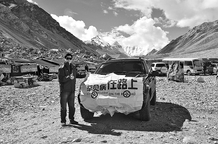 2015年,劉期達一個人自駕抵達珠穆朗瑪峰大本營,展示了一面寫有“罕見病在路上”的橫幅。受訪者供圖