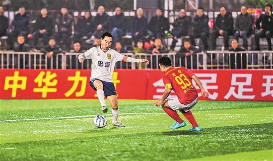 “村超”上賽季射手王、忠誠村球員董永恒(左)在比賽中帶球突破。