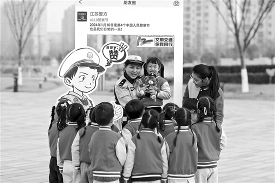 圖為交警和幼兒園小朋友在卡通造型前合影留念,共同慶祝人民警察節(jié)。