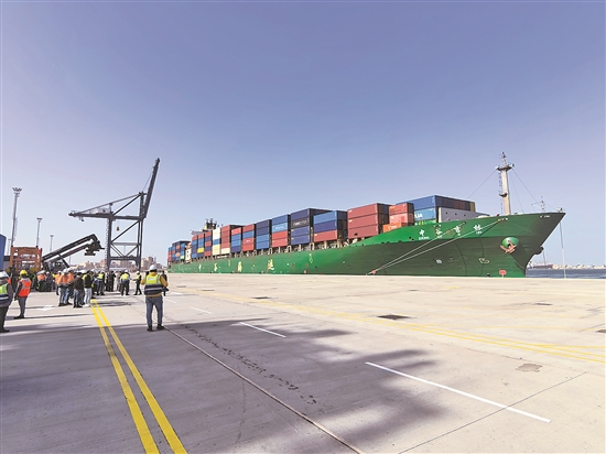 當(dāng)?shù)貢r(shí)間1月9日,在埃及亞歷山大,阿布基爾集裝箱港口碼頭迎來(lái)第一艘船“中谷吉林”號(hào)靠港。新華社發(fā)(徐剛 攝)