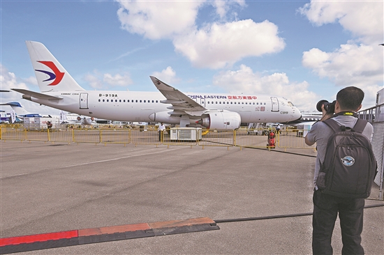 2月20日,一架中國東方航空公司C919客機在新加坡航展上做靜態展示。
