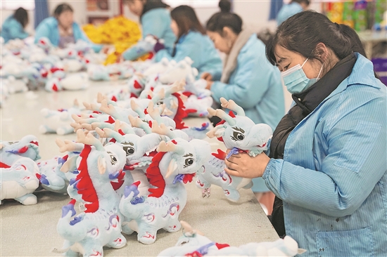 2月20日,安康某動漫文化產業公司的工人在生產車間內加工龍年生肖主題的毛絨玩具。