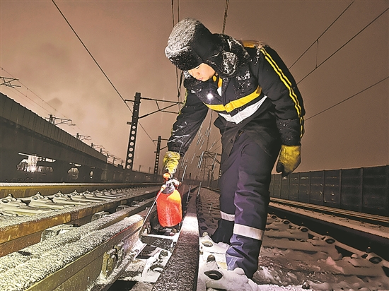 圖為職工對(duì)道岔滑床板進(jìn)行掃雪除冰作業(yè)。 高英皓 攝