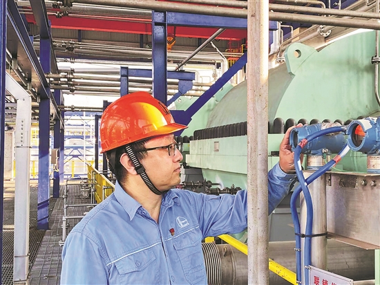 盧永正在檢查乙烯裝置裂解氣壓縮機的運行情況。受訪者供圖