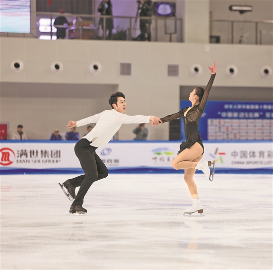2月25日,北京隊組合彭程(右)/王磊奪得雙人滑自由滑冠軍。本報記者 蔚可任 攝