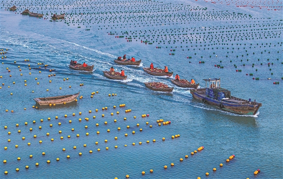 春節剛過,在山東省榮成市的各個海洋牧場里,養殖船來往穿梭,養殖工人緊張作業,一派海上“春耕”的繁忙景象。