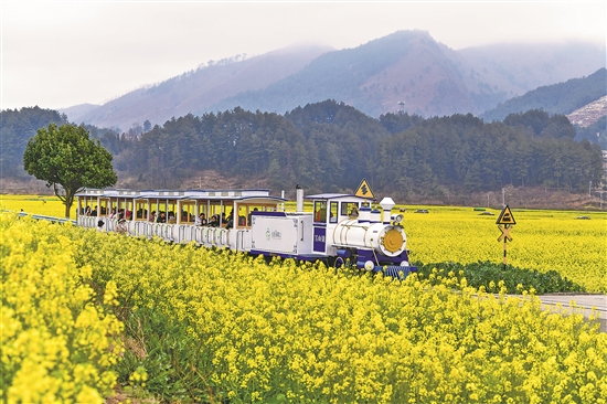 3月3日,在貴州省貴定縣盤江鎮“金海雪山”景區,游客乘坐觀光小火車觀賞油菜花。