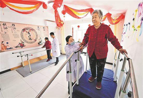 2月29日,在香河縣安平鎮運河新村醫養中心,老年人在進行康復訓練。