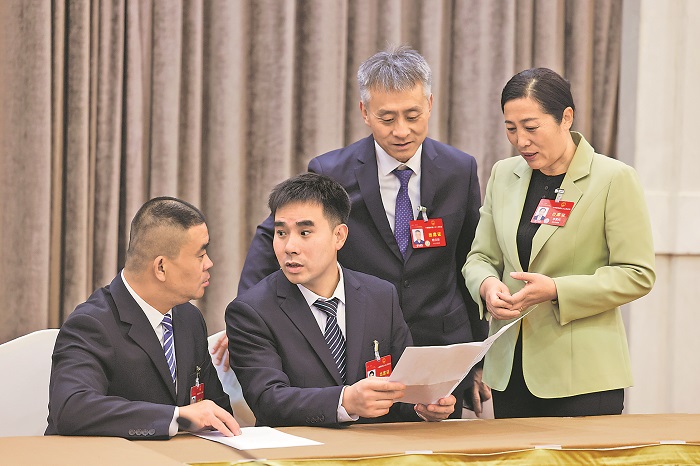 3月5日,在河北代表團駐地,冀中能源峰峰集團新屯礦機電區(qū)副區(qū)長顧博代表(左二)與北京建工三建機電分公司水電安裝隊隊長譚雙劍代表(左一)、邯鄲市農(nóng)業(yè)科學(xué)院生物技術(shù)中心主任楊保新代表(左三)、保定市清苑區(qū)南王莊瓜果蔬菜專業(yè)合作社理事長李素環(huán)代表在討論政府工作報告。