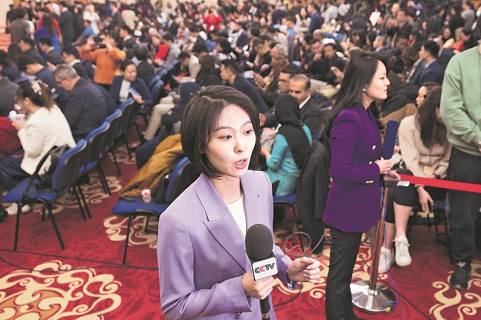 3月7日上午,在十四屆全國人大二次會議舉行的記者會現場,兩名女記者進行現場直播。本報記者 王偉偉 攝