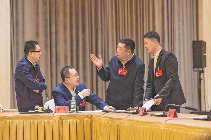 3月8日,在黑龍江代表團小組會議結束后,通用技術齊齊哈爾第二機床有限責任公司配套分廠精密車間馬恒昌小組組長馬兵代表(右二)找到中車齊齊哈爾車輛有限公司貨車分廠電焊高級技師、高級工程師王海代表(左二),就馬兵代表提出的關于深化產業工人隊伍建設改革,增強勞模工匠榮譽感、自豪感的建議展開討論。同行的哈爾濱紅光鍋爐集團環縫焊接組組長周曉龍代表(右一)和龍煤集團鶴崗礦業公司峻德礦山電氣設備維護安裝公司黨支部書記兼經理許曉林代表(左一)聽到后也加入討論。