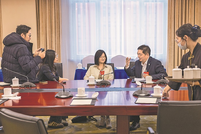 3月8日,在上海代表團小組會議后,東浩蘭生集團上海工業商務展覽有限公司能源展部經理陳達代表(左三)與中遠海運船員管理有限公司上海分公司油運庫船長倪迪代表(右二)就復合型人才的培養問題進行交流。