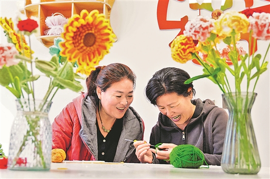 4月14日,在山東省菏澤市巨野縣鳳凰社區(qū)黨群服務(wù)中心“巧手工坊”,居民正在鉤織手工藝品。