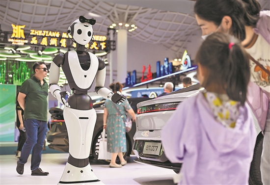 4月15日,第四屆消博會湖北展館的一臺AI人形智能服務機器人在與觀眾進行互動。