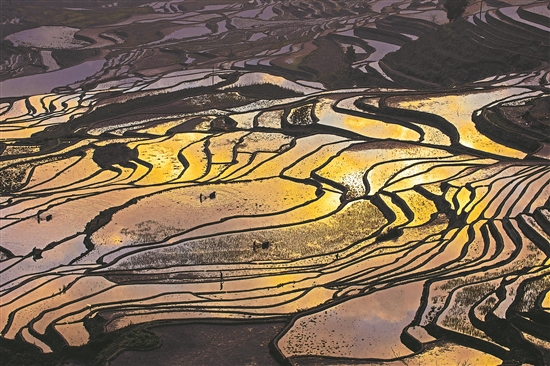 在云南哀牢山南部,世居在此地的哈尼人沿著山坡開墾梯田。梯田自河谷延伸到海拔2000多米的山上,每年春耕開始的時候,自山頂的“龍潭”放水灌注梯田。當太陽升起,萬畝梯田金波閃耀。本報通訊員 溫昀妍 攝