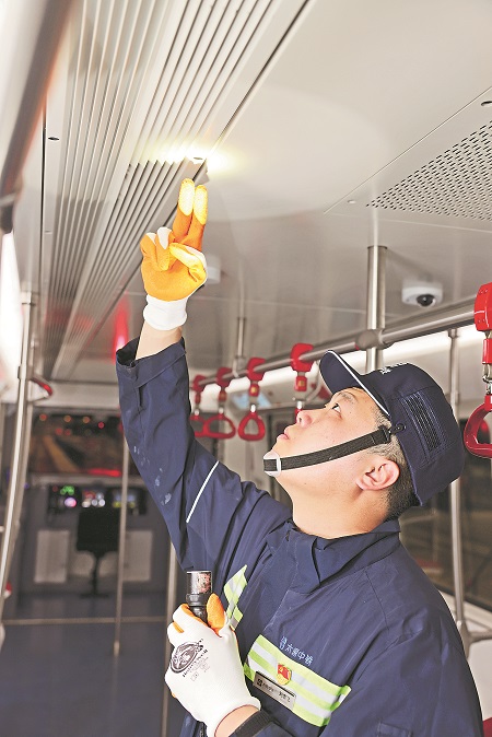 深夜,飛馳了一天的地鐵列車“下班”了,這也意味著,我的“出診”時間到了。檢修地鐵列車需要查看的細(xì)節(jié)成百上千,每扇窗戶、每道螺栓、每條管線……都要做到手指、眼看、口呼。