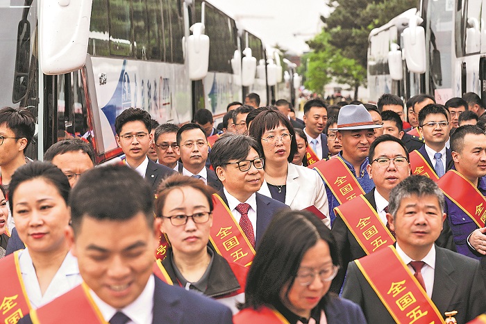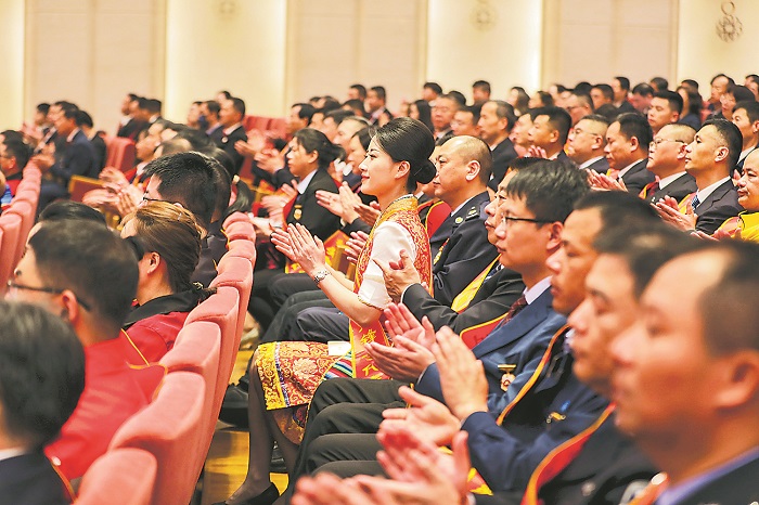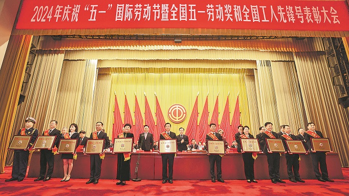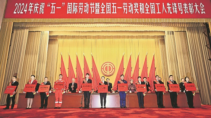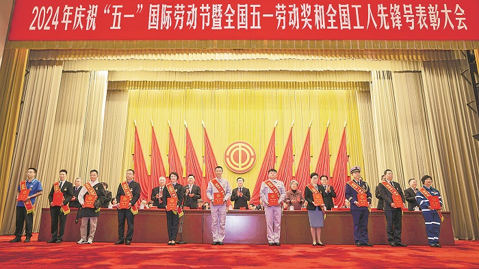 全國(guó)五一勞動(dòng)獎(jiǎng)?wù)芦@得者代表上臺(tái)領(lǐng)獎(jiǎng)。