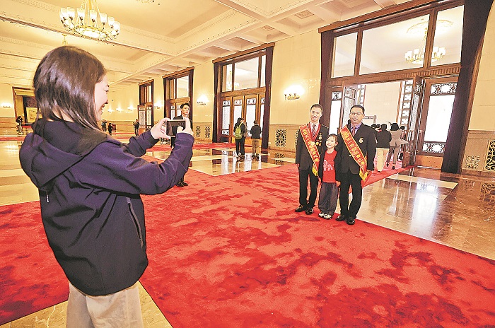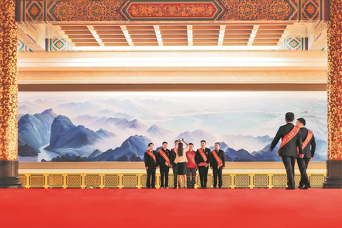 表彰大會(huì)開始前,獲獎(jiǎng)代表們?cè)诒本┤嗣翊髸?huì)堂里的《長(zhǎng)江萬(wàn)里圖》前合影。