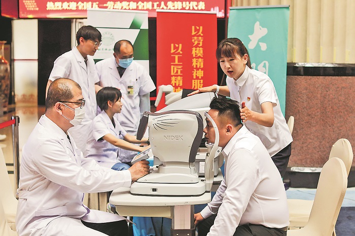 4月27日,中國(guó)職工之家,剛剛抵達(dá)駐地的代表們進(jìn)行免費(fèi)的眼睛檢測(cè)。