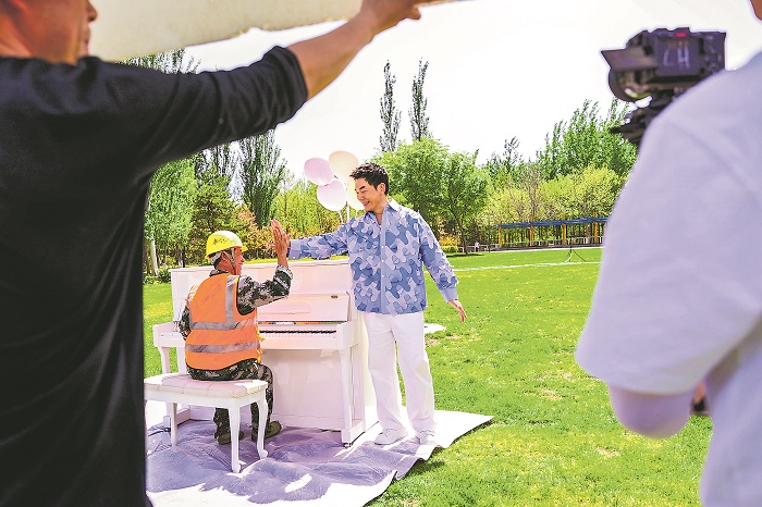 4月18日,央視總臺(tái)在中關(guān)村軟件園內(nèi)的一處草坪上錄制2024年“中國(guó)夢(mèng)·勞動(dòng)美”慶?!拔逡弧眹?guó)際勞動(dòng)節(jié)心連心特別節(jié)目,來(lái)自深圳的建筑工人易群林應(yīng)邀與知名歌手任賢齊搭檔演出。