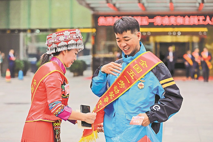 中國(guó)職工之家門口,今年的全國(guó)五一勞動(dòng)獎(jiǎng)?wù)芦@得者粟瓊(圖左)幫助另一位獲獎(jiǎng)?wù)吆槌赡菊砭R帶。