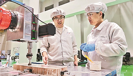 為提升加工精度,團隊成員絞盡腦汁。起初拋光鏡面時,很容易出現劃痕或瑕疵,他們連續加班了3個多月,做了很多試驗,不斷修改加工參數,嘗試不同材質的拋光工具和不同粒徑的磨料,更換不同的添加劑、摸索不同的組合,終于找到了最佳工藝參數。